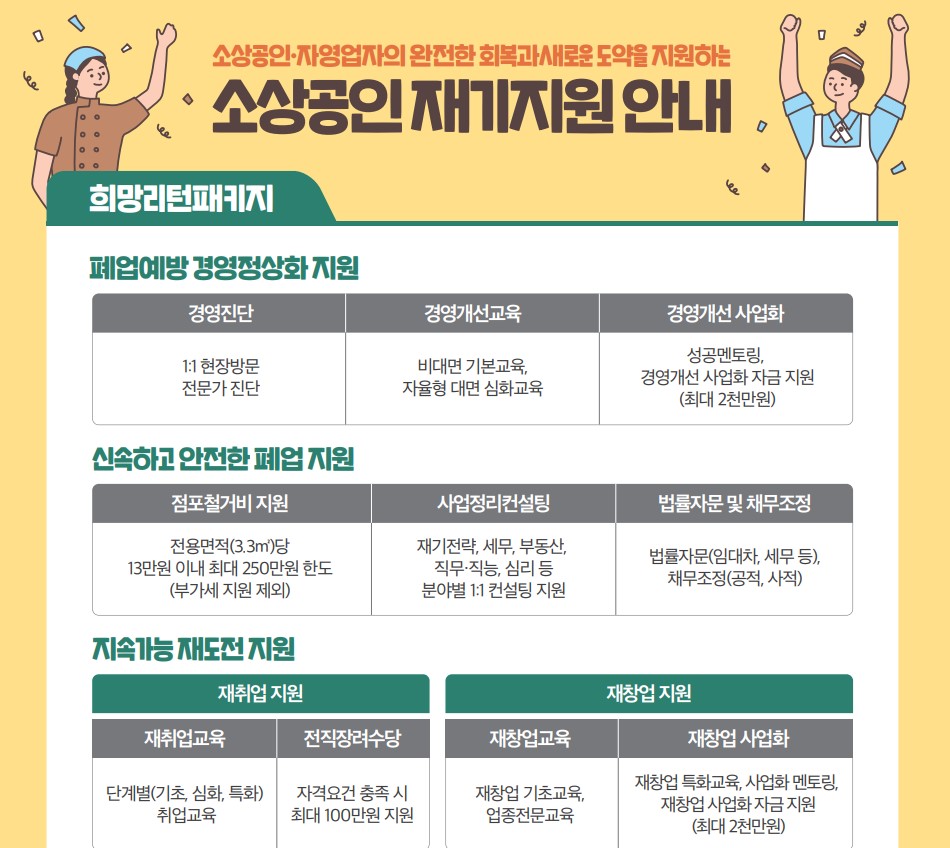 : 폐업 소상공인(폐업 예정 사장님, 폐업 사장님)의 구직활동 등에 따른 장려수당을 지급하여 임금근로자로의 안정적인 전환 및 재기를 지원하는 프로그램 입니다.