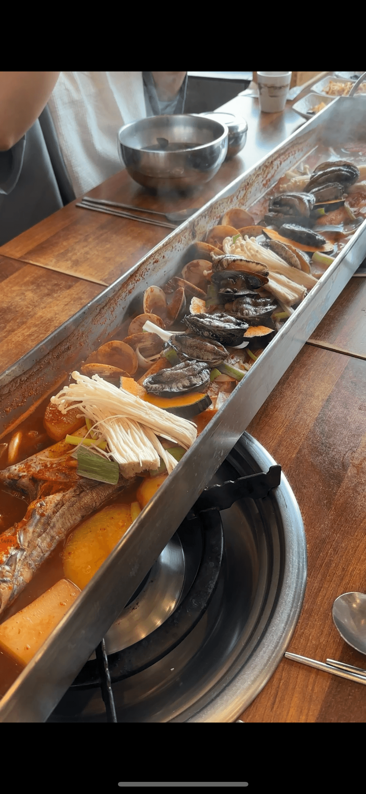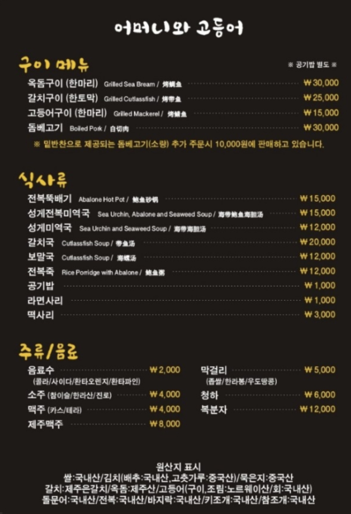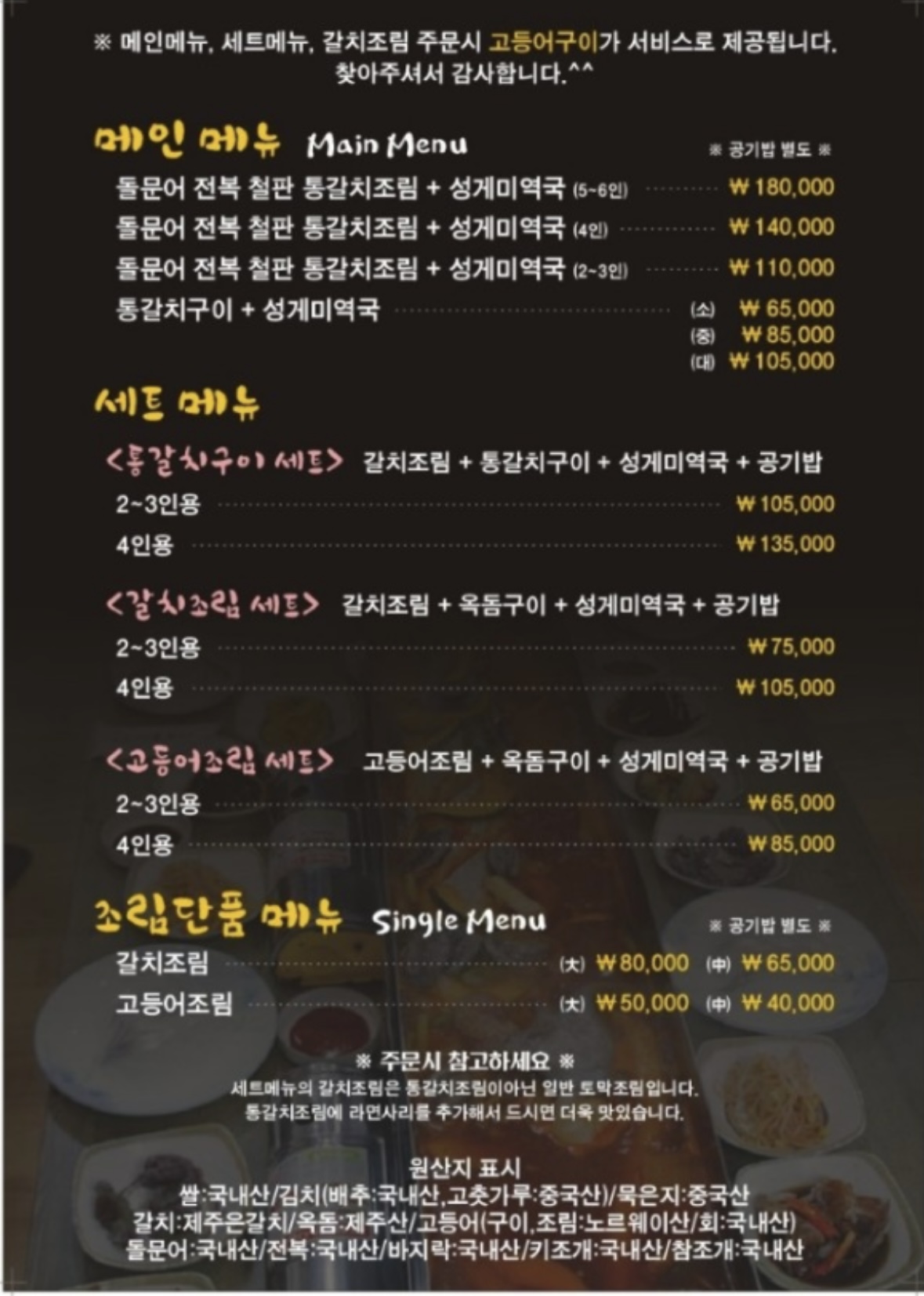 갈치조림을 중심으로 정통 한국 가정식의 맛을 선사하는 데 중점을 두고 있는 곳입니다. 현지에서는 '고등어조림'으로 알려진 이 요리는 간장, 마늘, 생강 및 다양한 한국 향신료로 만든 풍미 가득한 소스에 고등어를 조린 요리입니다. 그 결과 한국 가정식의 정수를 구현하는 부드럽고 풍미 가득한 생선이 탄생했습니다. 4인 이상이 방문한다면 갈치조림 세트메뉴를 추천하고, 2인이 방문한다면 고등어구이를 추천합니다. 저희는 5인가족이 방문했고, 돌문어 전복 철판 통갈치조림 + 성게미역국(5~6)인 세트 180,000원 (공깃밥별도)를 먹었는데 넉넉하게 잘 먹고 왔습니다.